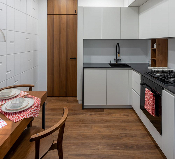 Дизайнер Инна Файнштейн выбрала стиль классического английского паба, одновременно строгий и уютный. За строгость в данном интерьере отвечает плитка, а за уют — наш SPC-паркет My Step Аква Вуд MSV02H АДЕН.