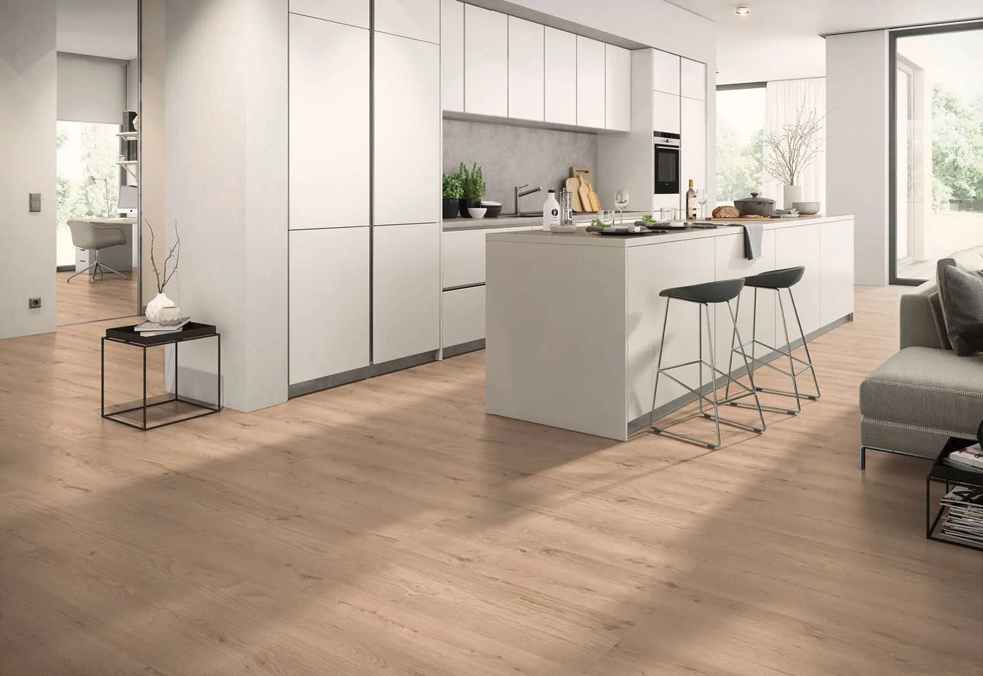Коллекция Гранде ХХЛ производится в Германии на заводах Classen. Ее ключевые достоинства — увеличенный формат доски для монолитного бесшовного вида, высокая плотность HDF-плиты толщиной 10 мм, износостойкость класса AC5/33, водостойкость 24 часа, дополнительная защита от царапин и антистатическая обработка, водостойкая замковая система Megaloc Aqua Protect, которая гарантирует не только простую и быструю укладку, но и защиту от влаги в стыках, матовая поверхность, четырехсторонняя фаска с гидрофобизацией краев ISOWAXX, шикарный внешний вид и сертификат экологичности Blaue Engel.